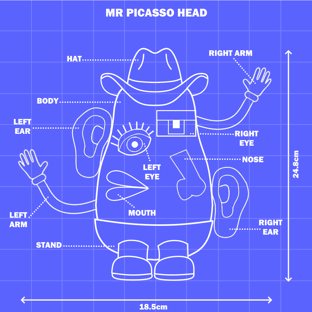 Each Mister Picasso Head has been randomly generated from 11 different attribute parts plus a background.